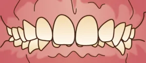 下の前歯で上の前歯を押し上げている状態が常時続くため上の前歯に負担をかけた状態が続き、歯の神経、歯の周辺、骨や歯肉などに炎症を引き起こす可能性があります。また、重度の過蓋咬合の場合は下の前歯で上前歯の裏側の歯茎を傷つけるケースもあります。